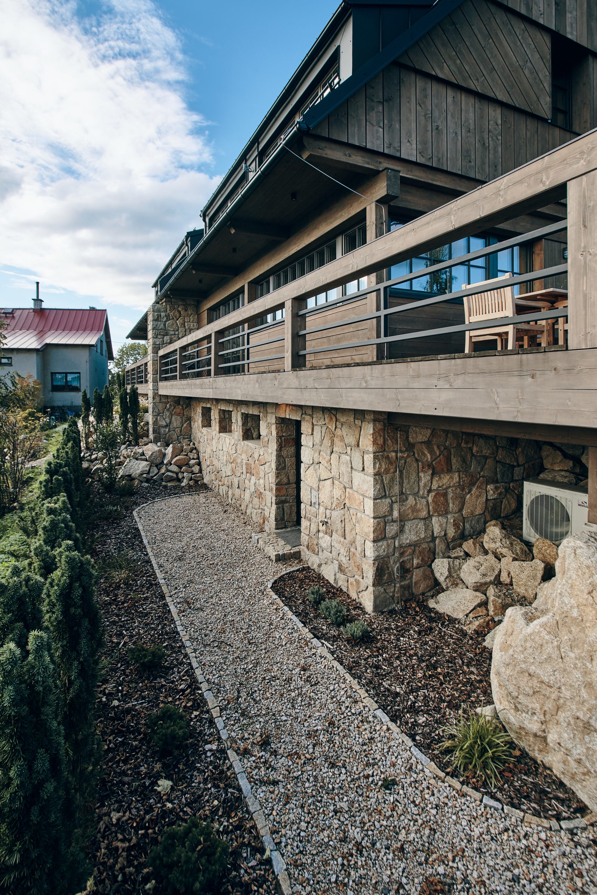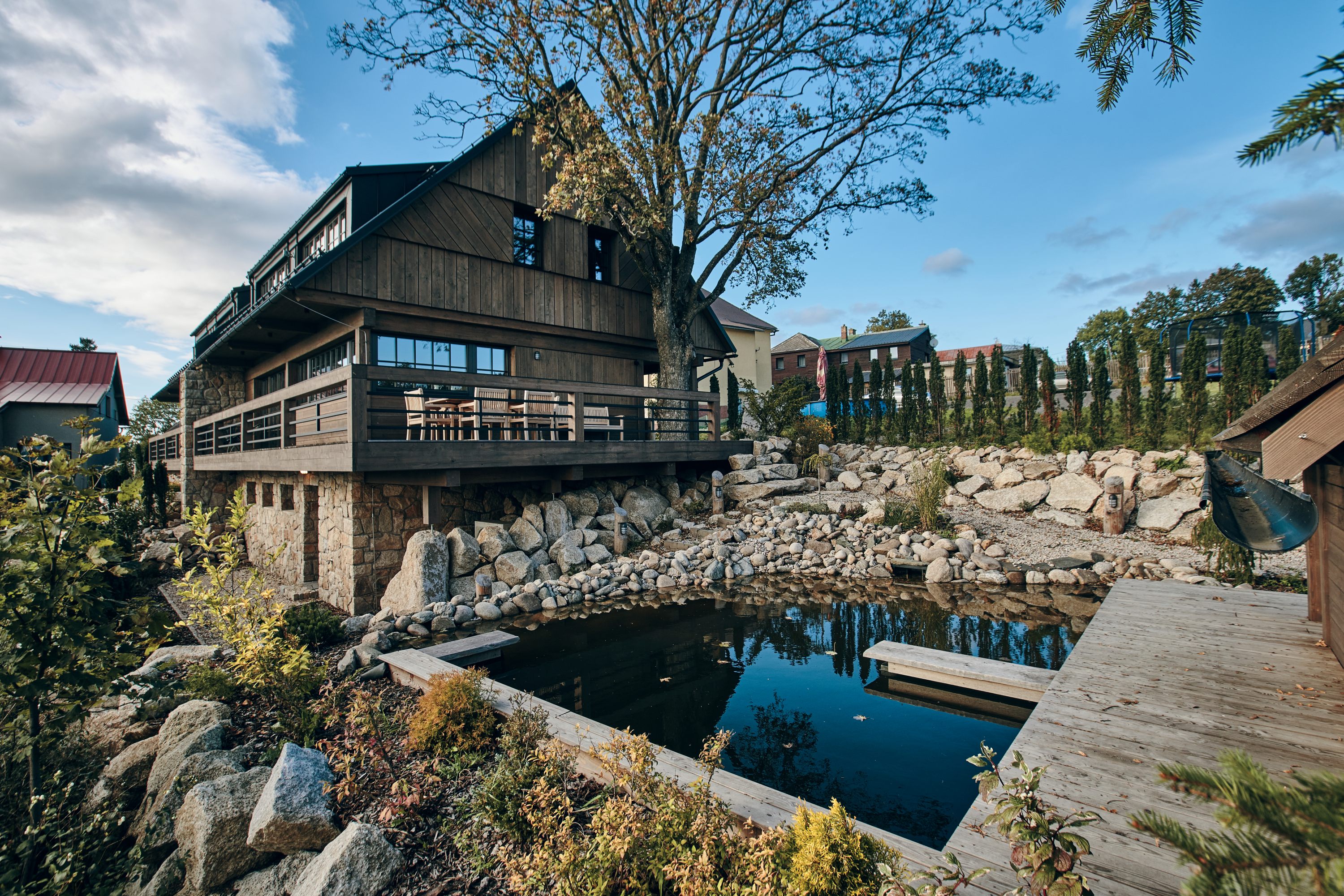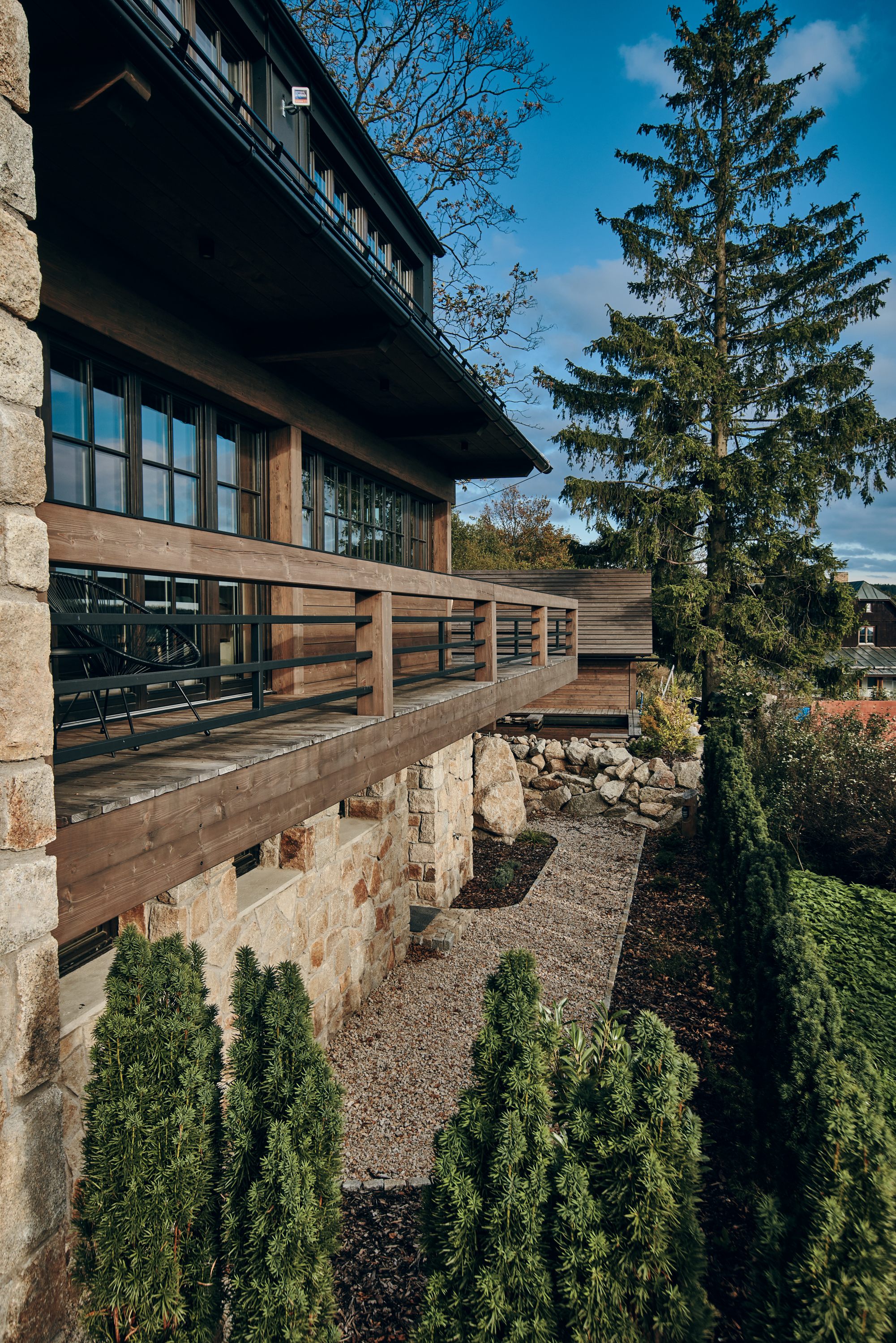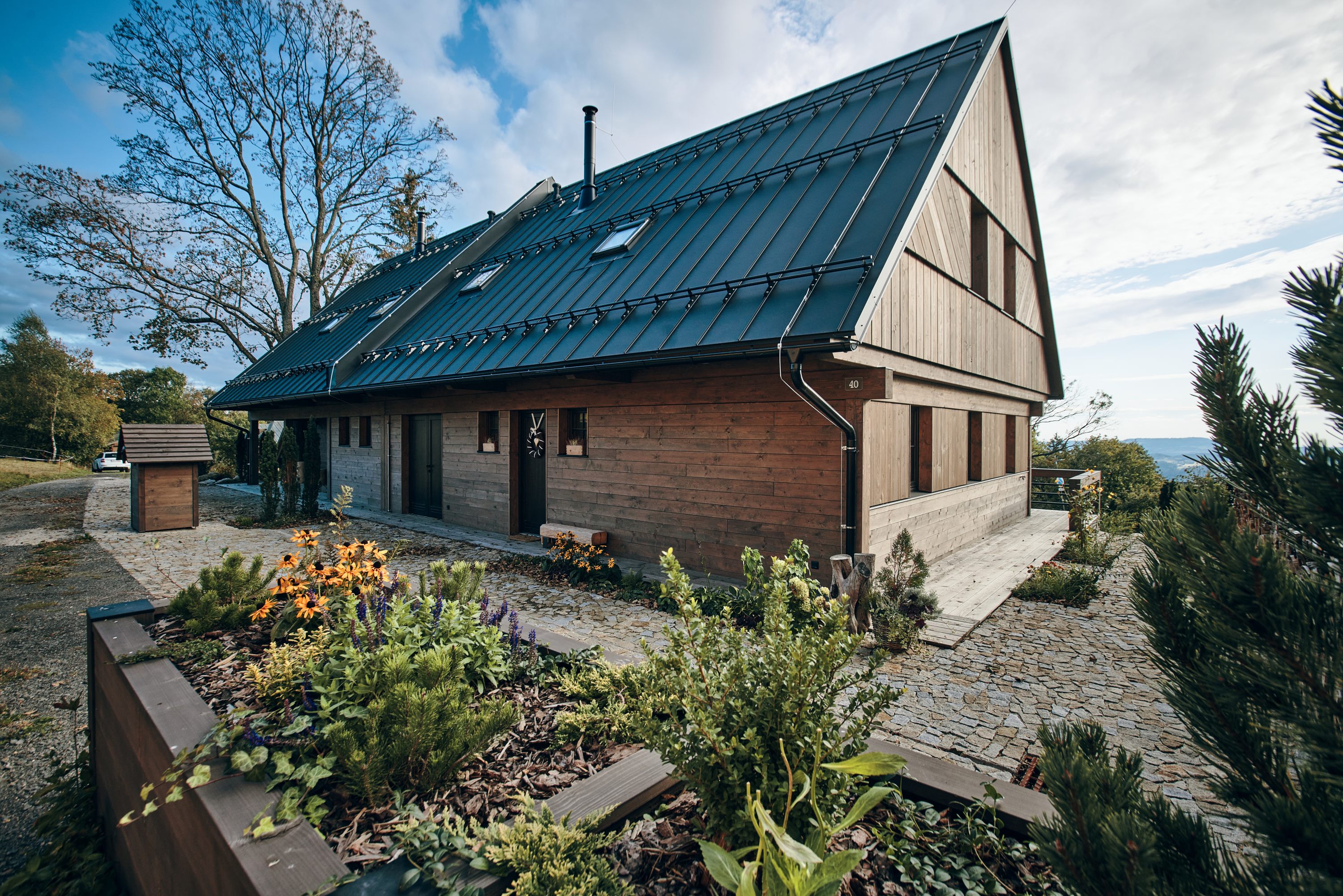 Tento projekt byl zajímavou výzvou pro realizaci nestandardního požadavku na návrh moderní řadové chalupy. Jelikož je objekt v zástavbě obce CHKO, museli jsme mimo jiné vycházet z původní zastavěné plochy, ilustrativní fotografie předchozího stavu přikládáme níže. Další výzva tohoto projektu byl vzrostlý javor, kterého nám bylo líto pokácet. I přes všechna možná negativa, která s sebou jeho přítomnost při stavbě přinesla, jsme jej zachovali. A věřte, že naši kolegové všech možných řemesel ho nejednou proklínali :).