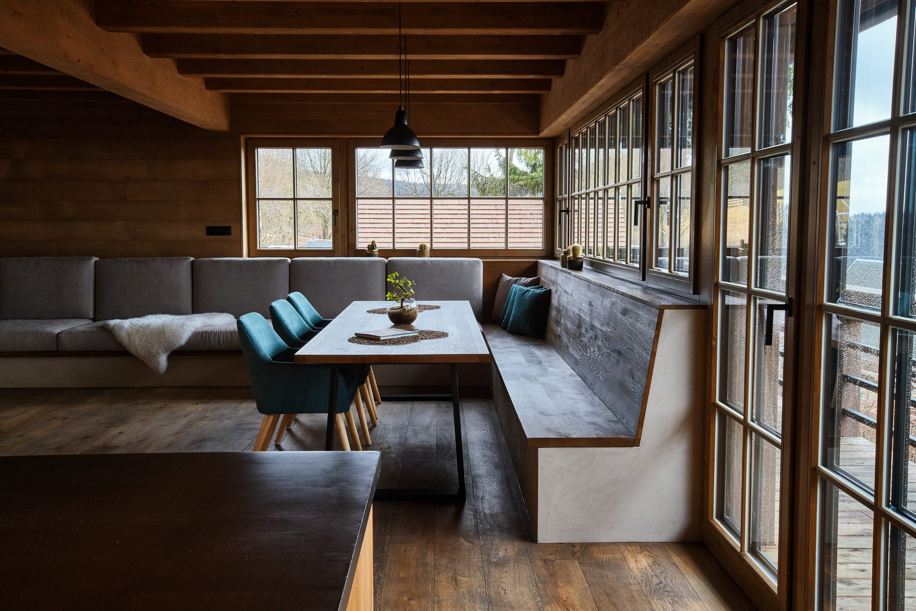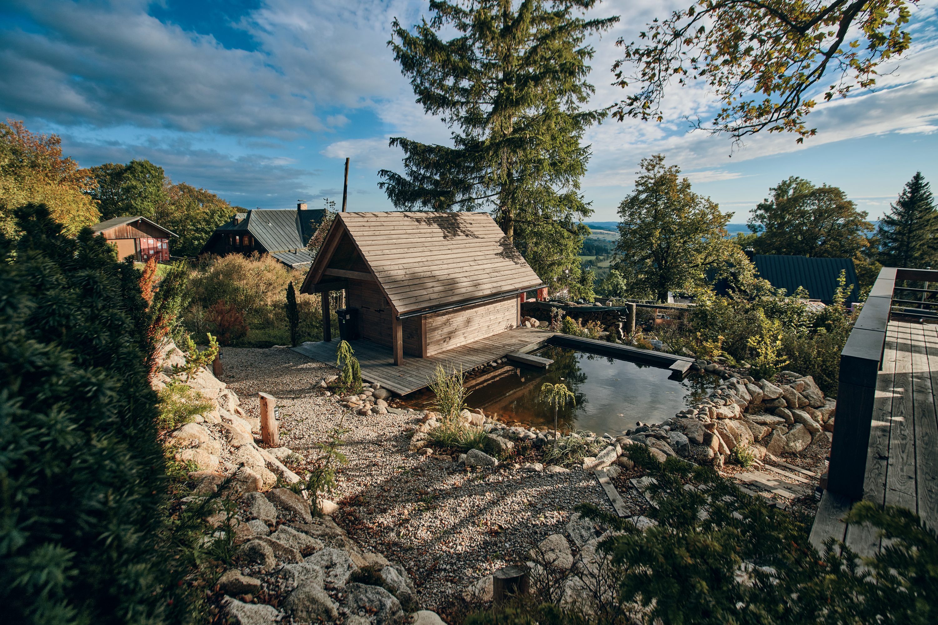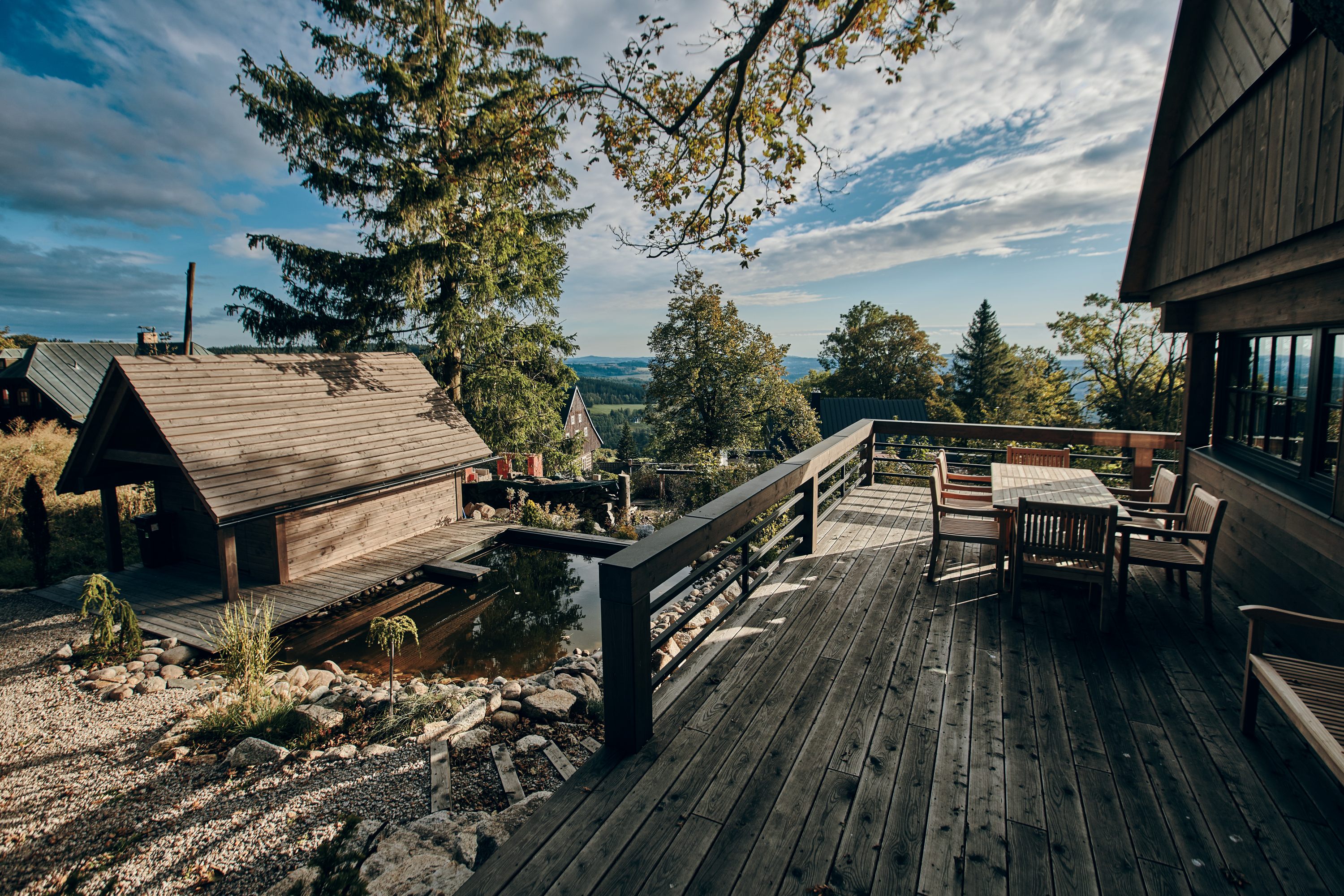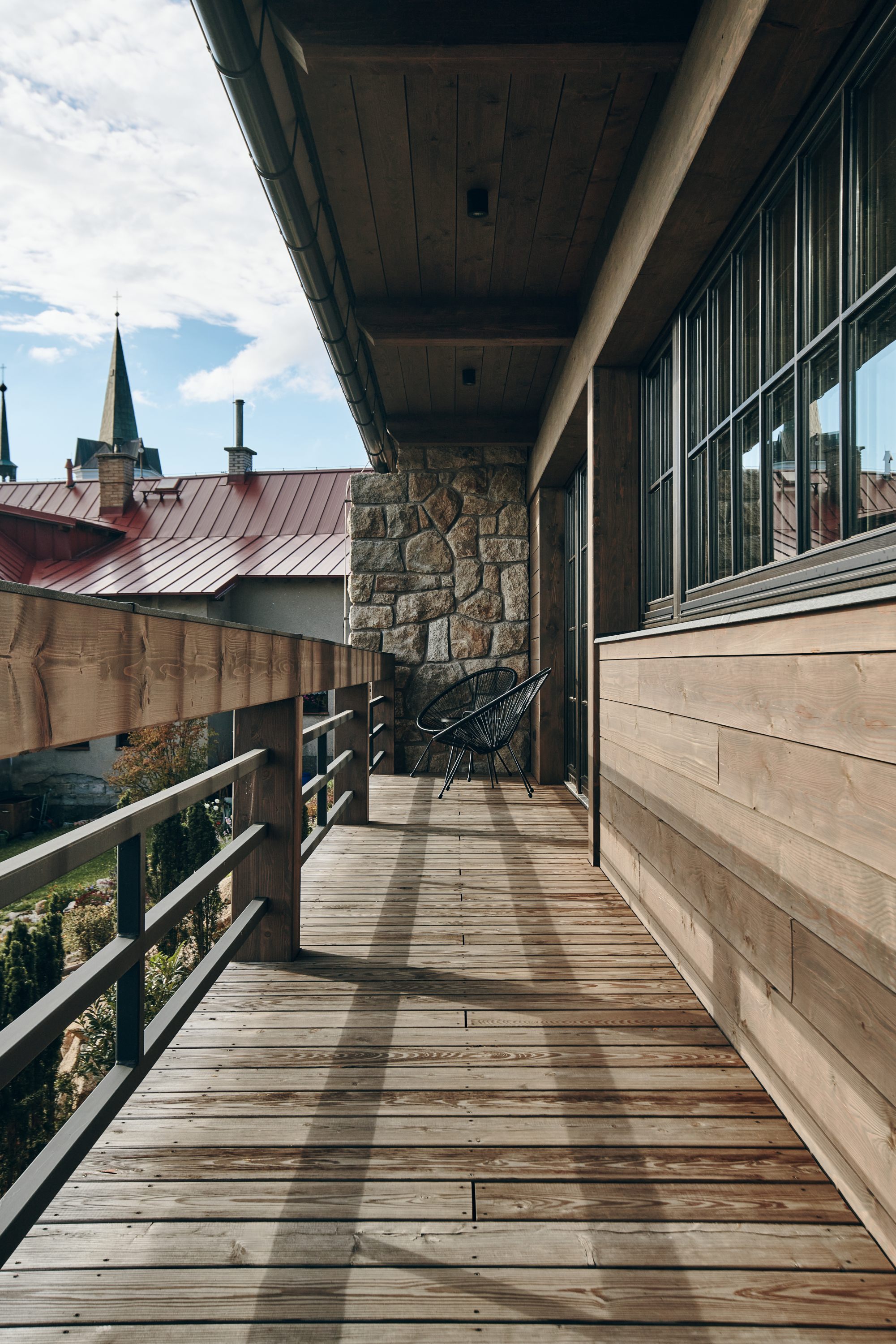 Tento projekt byl zajímavou výzvou pro realizaci nestandardního požadavku na návrh moderní řadové chalupy. Jelikož je objekt v zástavbě obce CHKO, museli jsme mimo jiné vycházet z původní zastavěné plochy, ilustrativní fotografie předchozího stavu přikládáme níže. Další výzva tohoto projektu byl vzrostlý javor, kterého nám bylo líto pokácet. I přes všechna možná negativa, která s sebou jeho přítomnost při stavbě přinesla, jsme jej zachovali. A věřte, že naši kolegové všech možných řemesel ho nejednou proklínali :).